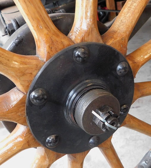 This is the location of the cotter pin that Paul forgot to install. After working on the rear wheel, Paul installed it and tightened the axle nut. Then he installed the hub cap. Everything was fine until one day on tour Paul noticed a Model T rear wheel passing him. His car suddenly tilted, and he was stuck in the middle of the road. The wheel continued down a hill and out of sight. The rest of the group muscled the car off the road, then started a search for the missing wheel. Eventually it was found and reinstalled. With a cotter pin this time.