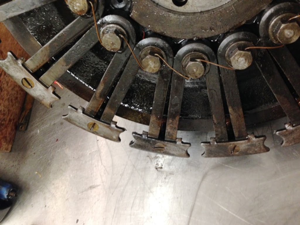 This photo shows a 1914 flywheel that is unmolested since Ford assembled it at the Walkerville plant in Canada. The brass lock wire goes through each of the flywheel bolts securing the inside of each magnet. Meanwhile the outer ends of each magnet is secured by a brass screw, The ends of the brass screws are “peened” which swells the screw into the hole. These screws, like any bolt or screw that is secured by peening, need to be thrown away any time they are removed.
