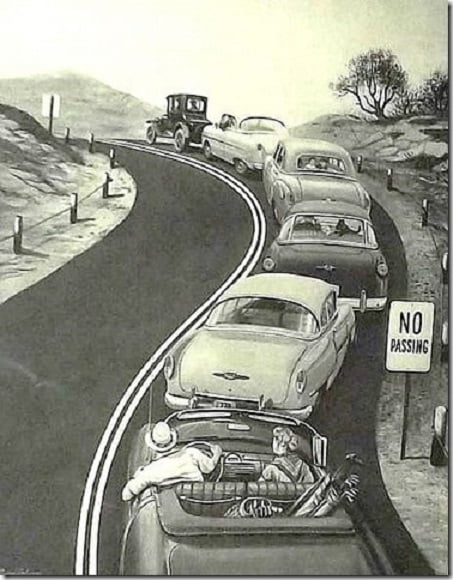 Operating your Model T safely sometimes means that you need to be considerate of others. Every now and then check your rear view mirror. If you see a long line of modern cars you should pull off somewhere safe and let them pass. Otherwise some drivers might get frustrated and try to pass in an unsafe manner.