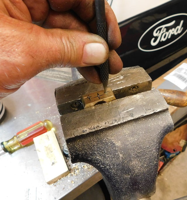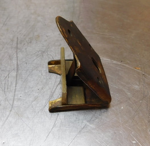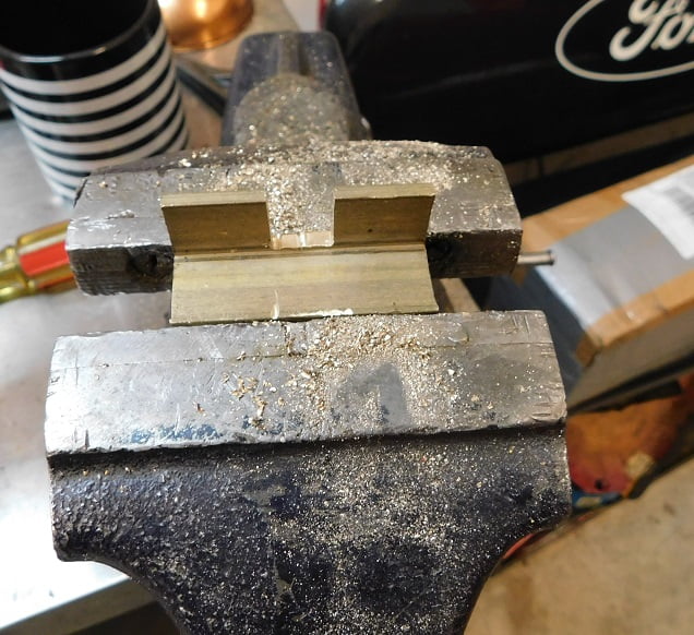 We start with a piece of brass L – angle scrap that is laying around. It is .125″ thick and 3/4″ on both legs. We cut a notch in the middle to leave two legs to pick up the screw holes on the speedometer bracket.