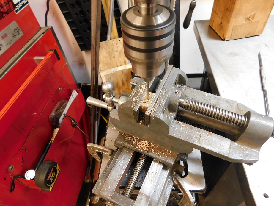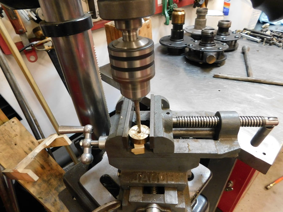 Our brass disc spent some time at the drill press. We drilled it #40, #21, 1/4″ , 29/32 ” and then step reamed it to the diameter of the mounting stem on the clock which was .500″. I won’t show every step, just this one.