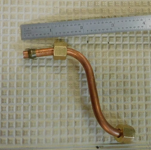 With our manifold and carburetor rebuilt and ready to install we cleaned the steel rings from the previous intake. The copper gland rings are new. We removed the previous intake and carburetor, using half clamps to hold the exhaust manifold so we would not need to replace the four exhaust manifold glands. We cleaned the intake ports using a razor blade, scraping away traces of silicone sealant.We put a tiny bead of “The Right Stuff” around each steel ring, then laid the glands on top, and put another tiny bead on top of each copper gland ring before installing the intake and carburetor.The stock throttle rod was not quite long enough so we fabricated a new one using 4130 3/16″ steel rod. 3/32″ (#40 AWG) holes were drilled in each end for cotter pins.We bent up a piece of 1/4″ OD copper tubing to make an adapter line. If this were going to be a permanent installation steel tubing would be used.We ended up removing the carburetor in order to be able to install and tighten the fuel line properly. Access is terrible with the carburetor installed.We made a new choke pull wire from an old coat hangar.With the carburetor installed we turned on the gas and checked for leaks. It had none so we are ready to go!