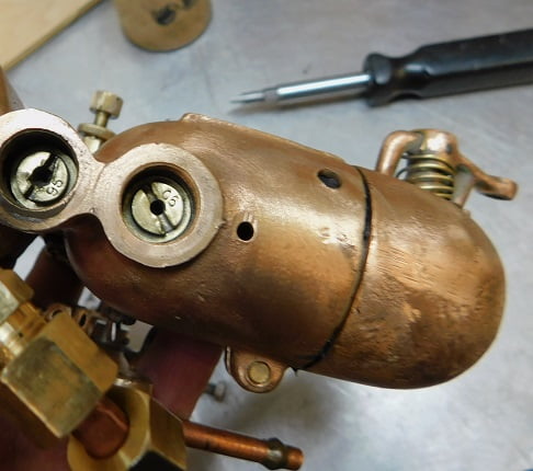 We pulled the carburetor and drained the gas from it. The jet covers were removed so we could try another set of jets.We installed the two jets from our second “parts” carburetor. The main jet is on the right, compensating jet on the left.