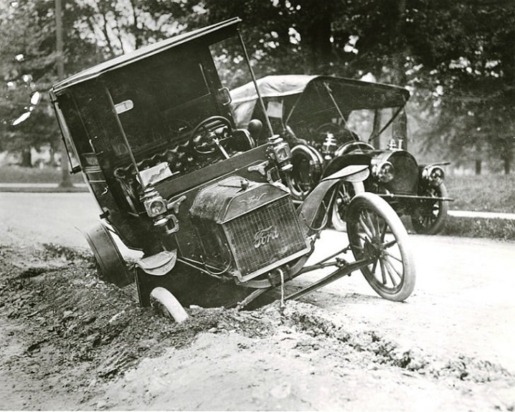 The 1909 Model T Fords were equipped with kerosene parking lamps, horn, tail lamp and headlamp mounting forks as standard equipment. Mud was always an option!