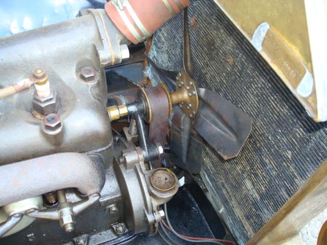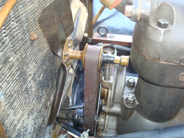 Details in the above photo are consistent with all Model T’s from serial number 2500 until mid 1912 model year. The entire front of the engine was redesigned to eliminate the pesky water pump. The fan belt tension was set by a spring loaded upper pulley arm.