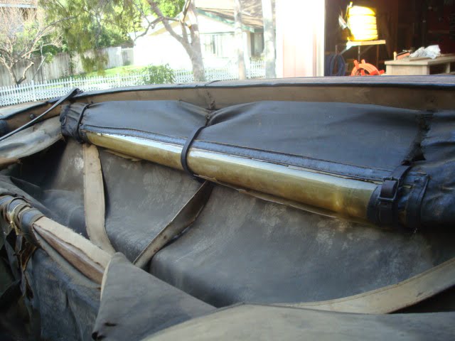 Above, when not in use the acetate windshield is rolled up and strapped to the underside of the top. Shown is an original top in 1910 touring S/N 21904 owned by Bryan Ostergren.