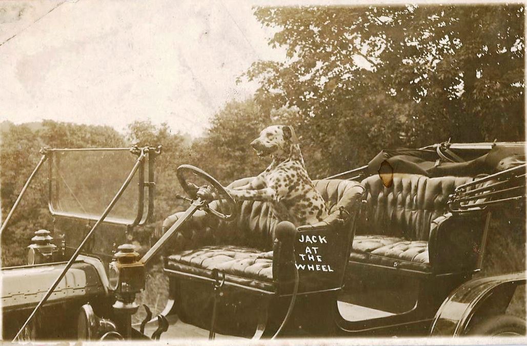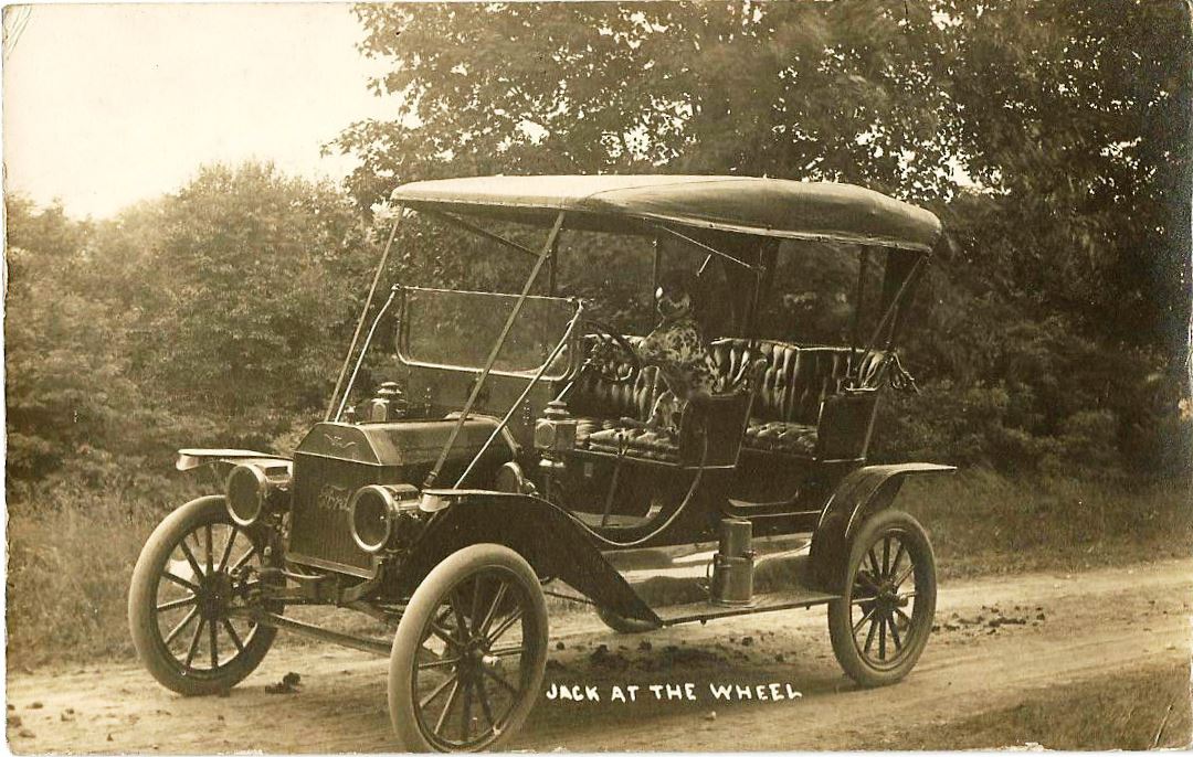 A 1910 Tourabout with a good looking dog “driver” is equipped with the complex and interesting Mezger Automatic Windshield.