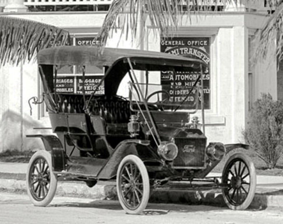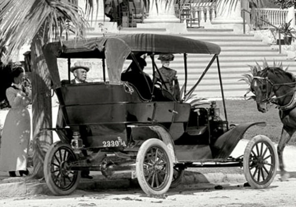 Passengers departing a swanky Miami Beach hotel decide whether they will go by carriage or in the new Model T Ford. We sometimes forget that until after World War I the main mode of transportation in the United States was still not the automobile. Ford was making and selling as many Model T’s as he could, yet there were still millions of horses and buggies in use.