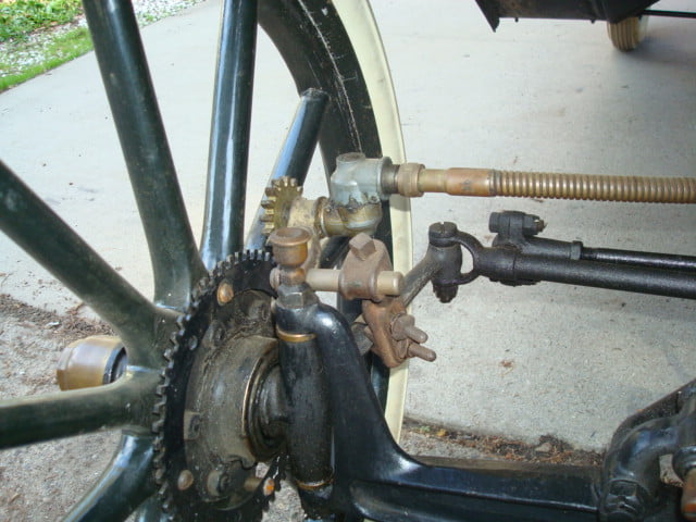 Stewart speedometer swivels used in 1910 were made from pot metal, brass plated, in 1:1 ratio. The steel wheel mounted “road gear” had 60 teeth and was also brass plated. The smaller driven gear is solid brass. Cable assembly is a steel case wrapped with brass sheathing. Nuts on both ends of the cable are solid brass.