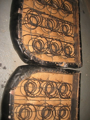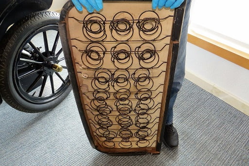 Seat cushions were made of a steam bent wooden frame with spring strips nailed to the top and burlap stretched across the springs before the upholstery was installed. The upholstery is nailed to the wooden frame. This is a detail often missing on “restored” early T’s because it is time consuming and costly to reproduce.