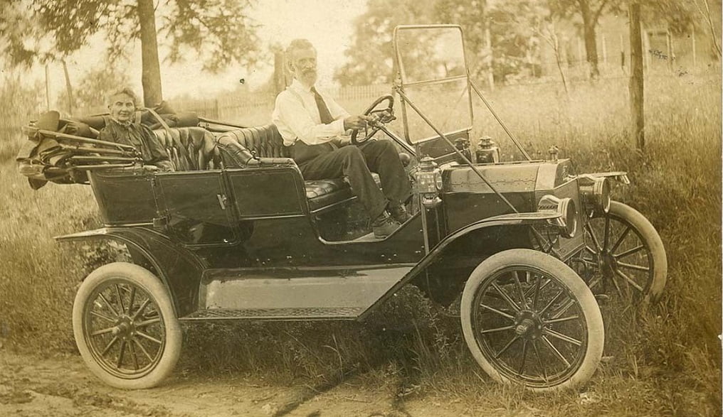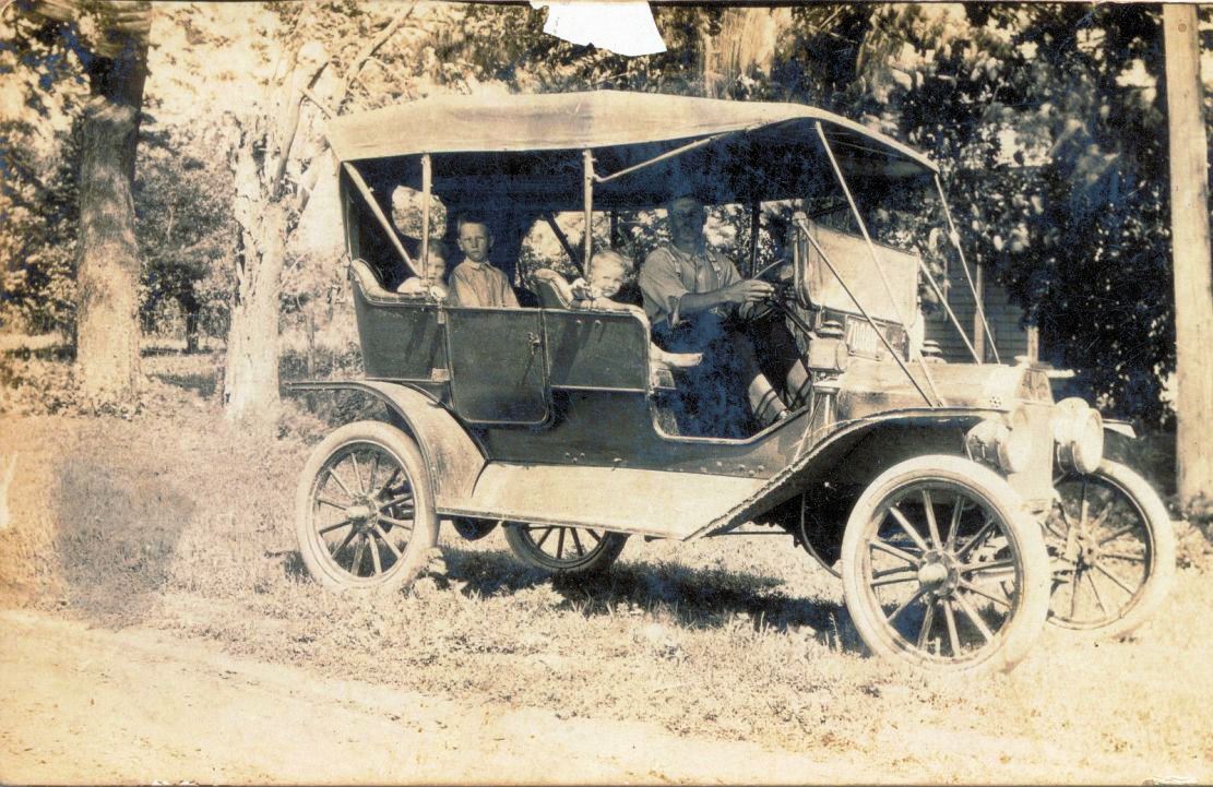 Above we see Dr. David O’Donnell and his family with their 1911 Model T touring. The car shows many features typical of 1911 including E&J model 666 headlamps and E&J Pat 1908 all brass side lamps. Perhaps the carbide generator has been moved to the passenger side of the car to make room for spare tires on the driver side running board. Also notice the double twist horn, again typical of 1911. The inlet tube for the horn now is raked downwards, almost matching the angle of the floor boards. This is an improvement over the 1909 – 10 double twist horns which have the inlet tube running parallel to the running board. Notice the bulge in the left front tire – and the low air pressure in the rear tire. He’s going to need those spares!