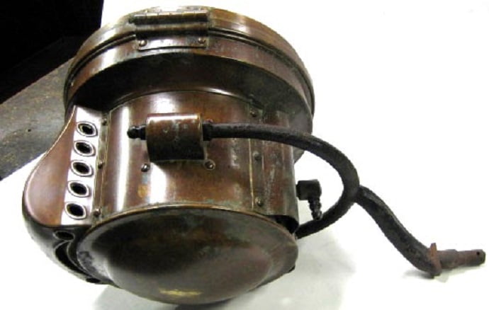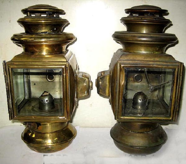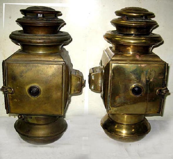 Above, looking at the rear of the bonnet on the E & J Model 666 lamps there is an exhaust port for hot gases that has a inverted “smile” between two round holes. This is how original lamps are made. There are reproductions of these lamps on the market, you can quickly spot the repros because they do not have the inverted “smile” between the two holes. The reproductions have been made since the early 1960’s and are often corroded enough that people believe they are old enough to be originals. Buyer beware!