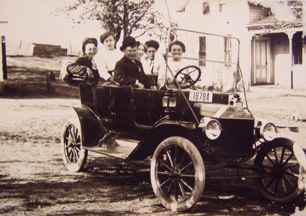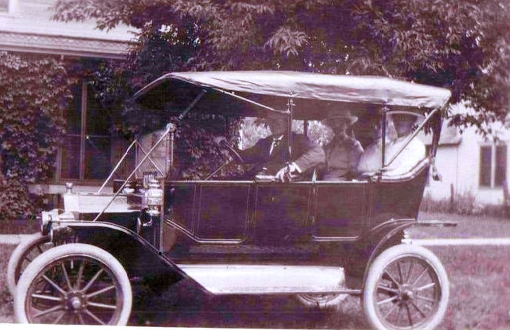 The well dressed ladies in this 1912 Model T touring would have had to prepare for the drive starting hours in advance. Their hair is piled on top of their heads in a bun. The hats are secured to the hair using hat pins so the hats do not blow off. The car is interesting in that the front door on the driver side opens, it has hinges and a handle. Notice the angle of the horn tube, this is typical of 1911 – 1912 double twist horns. The headlamps, cowl lamps, and carbide generator are all made by Edmunds and Jones. Notice the position of the carbide generator on the running board just forward of the Ford script.