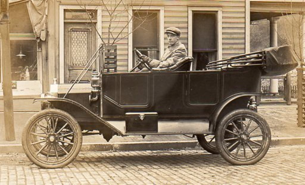 Another late 1912 “slab side” touring with the black and brass single twist horn, this time with the top up.