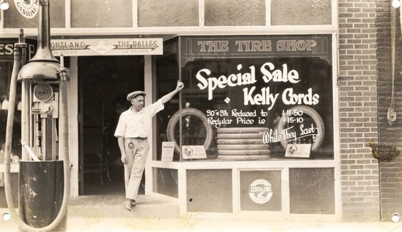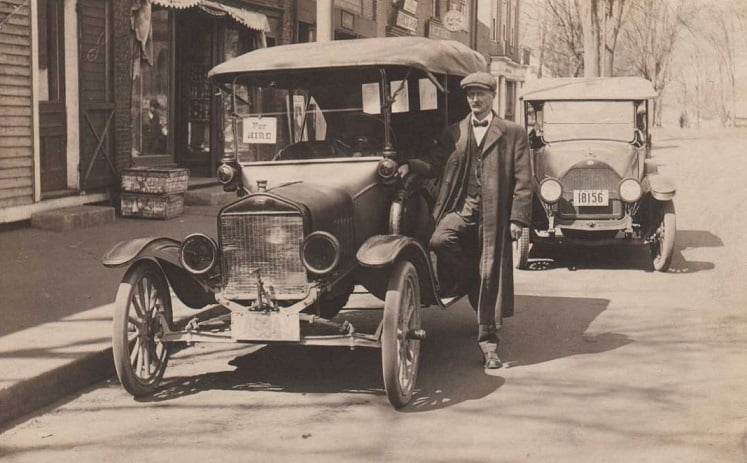1917 photo of the dash assembly area in the Highland Park plant. The steering wheels used in 1917 continued as before with a wooden rim and cast iron spider painted black. The steering gear quadrant and spark / gas levers were nickel plated. Paper sleeves protect the black paint on the steering column tubes. Notice the horn button on each column, the same type used in 1916 continued to be used for all of 1917 model year.Many auto makers raised prices as the war raged in Europe. The United States was not directly involved – yet. Model T Ford prices were down again for 1917 and would continue to drop every year for another decade.The Model T Town Car was in its final year of production in 1917, at least in the USA. The price was down to $595 and over 2300 were sold. Most ended up being used as taxi cabs.This Model T town car was used in a number of silent films in the 1920’s in and around New York city. This is a still shot from the 1920 silent film “One Week” which premiered in 1920.Very likely the same 1917 Model T town car from the movie “Speedy” starring Harold Lloyd and Babe Ruth.A snowy day in New York city. The trusty Model T town car awaits a paying fare.Not all taxis were town cars. This 1917 – 18 touring has its headlight and cowl light lenses blacked out which was required by some coastal cities after the United States entered the war in 1918. A new touring cost $360 in 1917. More than 360,000 were sold that year.New 1917 Model T Fords have just been unloaded from rail cars so they can be driven to the local Ford agency.The “Rip Van Winkle” 1917 Model T Ford touring. The car gained its nickname because it has less than 20 original miles since new. It remains in mostly original condition. Most of the mileage on the car was gained when the car was stolen and taken for a joy ride by some kids early in its life. The author is seen inspecting the car in 2015 when it belonged to Kim Dobbins of Harbor City, CA. The car is currently on diplay at the Ames Pontiac store in Spofford, NH.The body of “Rip” was produced in June 1917 with body serial number 238750 stamped in the floorboard riser just inside the front door..Rip’s engine retains its original smooth sided Champion X plugs. Someone added an accessory oil can mount at some point in the car’s history, this would not have been standard equipment from Ford.Fan and crank pulleys are the same small size used in 1916. The grease cup on the fan is aluminum as is typical of all Model T’s from 1913 – 1920.The coils found in Rip were the typical coil used in 1917 – 18. Instead of wooden boxes they were made using a molded plastic – like product invented by Henry Ford and Thomas Edison. The product is actually made from a resin containing wheat gluten. While it seemed to be a good idea at the time the wheat gluten coils tended to melt in hot weather, leading to erratic ignition performance. Ford went back to wooden coil boxes some time in 1918.Interesting details abound on Rip. The tires leaning against the car are two of the original 30 X 3 front tires that came on the car when new. They have Ford script on each tire, with white sidewalls inside and out. The smooth tread areas are black. The crank handle is the typical cast iron handle introduced in 1914. The car is still wearing its original 1917 Minnesota license plates.Ford offered the center door sedan in 1917 priced at $645. It was starting to catch on with buyers. More than 7300 were sold in 1917.This 1917 – 18 center door sedan has a number of interesting accessories including a spot lamp, Macbeth headlight lenses, and lever – type shock absorbers. Road conditions seen here were typical for most of the United States once you got outside of the city limits. The car shown is wearing 1920 Washington state license plates. A shiny new 1917 center door sedan outside the sales building at the Highland Park plant. Hopefully someone aired up the tires before attempting to drive very far!This shiny new 1917 Couplet was likely scrapped after hitting a street car. The Couplet, like the center door sedan, was much more popular than it was in 1916, Priced at $505 there were more than 7300 sold. There were two styles of Couplet in 1917, with the early couplets having a convertible top like the 1916 model couplets. This is the later version with a fixed top.This is an interesting photo of a 1917 couplet – look at the rear windows, there are two of them! The windshield was unique to the couplet and had many positions. In this photo the upper half is folded down.Bare trees and a winter front covering the radiator mean the weather has turned cold. A perfect day for driving the enclosed 1917 Model T Couplet.A highly accessorized 1917 couplet is shown with the side window pillars removed. The car has aftermarket wire wheels and some sort of electric cowl lamps. License plates are 1917 Ontario, Canada.It seems like Model T Fords were attracted to ditches, and there was always a photographer on hand when it happened. This 1917 touring appears to be nearly new and hopefully was repairable. The broken windshield probably did not help the driver’s complexion. Safety glass was more than a decade from becoming available in new Fords.A tire store in Portland, Oregon near the intersection of 4th and Oak streets about 1917. Tires are on sale for $11.50 each. This sounds cheap to us today, but it was anything but cheap. The average guy probably made $3 per day. A set of tires could cost as much as two weeks wages! You should also know that the average tire might only last 5000 miles back then, if you were lucky.The Model T Runabout could be converted to a tractor with these geared bull wheels. Reversing the process might take only a few hours.On the other hand this snow plow looks like it is pretty much non – reversible.