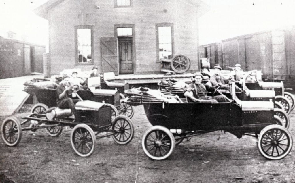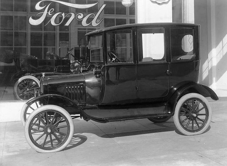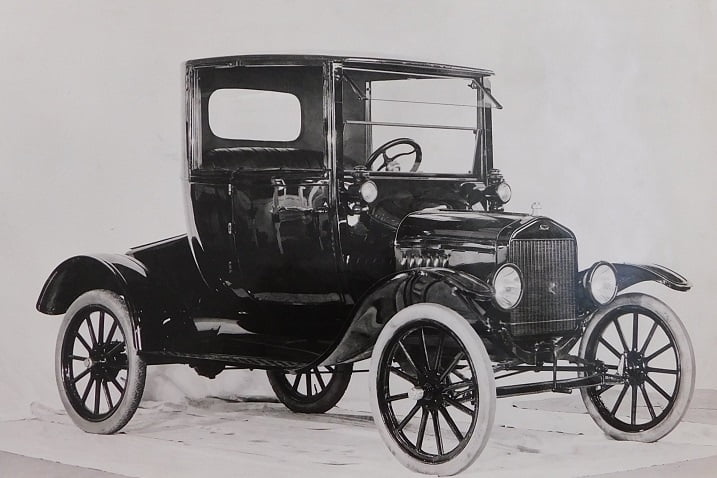 A car show in 1918 with the newest version of the couplet on display. The 1918 Couplet sold for $505 and it was even more popular than 1917 with over 14,000 sold. The one shown here has a nifty accessory bumper and demountable Firestone wheels.The window pillars were again removable in the new 1918 Couplet. As always, every Model T came with kerosene cowl lamps and tail lamp. Headlamps were magneto powered.A typical scene from back in the day. This 1918 couplet owner is searching for a pinhole leak so a patch can be applied.Hopefully all of these folks won’t try to ride home in the 1918 couplet together. Accessory wire wheels make this car look really snazzy.The windshield was another unique feature of the 1918 couplet. Now it was hinged at the very top, unlike the 1917 version.New for 1918 was the Ford factory built ambulance. Production records show that more than 2100 were built for delivery to the military. Most went overseas, a real one is quite rare today.RH rear 3/4 viewof the 1918 Model T ambulance in the lobby of the Sales Building, Highland Park Plant.The bare chassis remained popular with customers who wanted to provide their own body in 1918. Retail price was listed as $325, over 37,000 were sold..Another bare chassis custom body, in this case a flower delivery body with an interesting plate glass display window.A 1918 Model T Sedan (center door) sold for $645, and over 35,000 were sold as the sedan body style became more popular with consumers.The touring went down to $360 for 1918. Production was down to just over 432,000 cars due to Ford factories being used to produce war materials.The new 1918 light switch / horn button mounted in a new bracket to the steering column. Photo from the Lang’s catalog, https://www.moteltford.comThe TT truck chassis did not come equipped with a Fordson Tractor but it would certainly carry one.Buyers of the new TT truck were expected to furnish their own body. The variety of TT truck bodies seen ranges from utilitarian to fabulous.Even the frame is striped on theis 1918 Ogden Packing Company TT Truck.