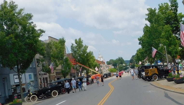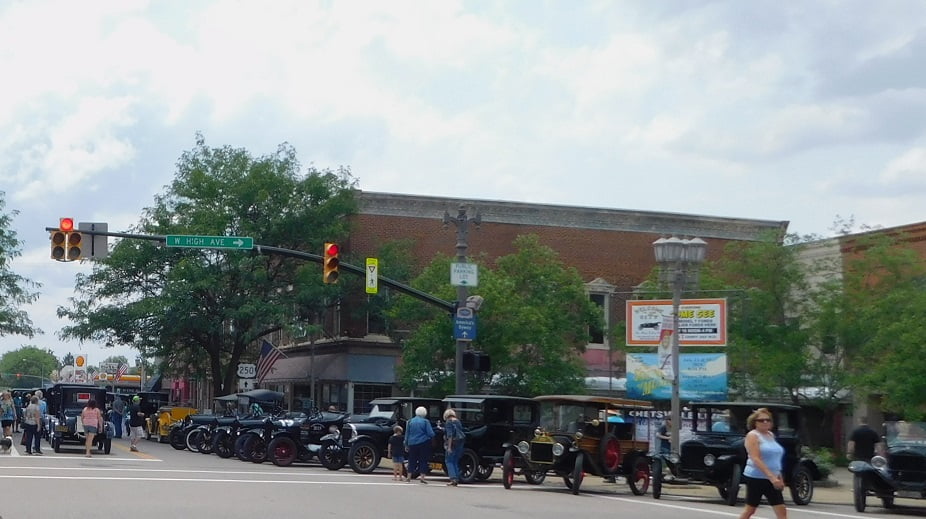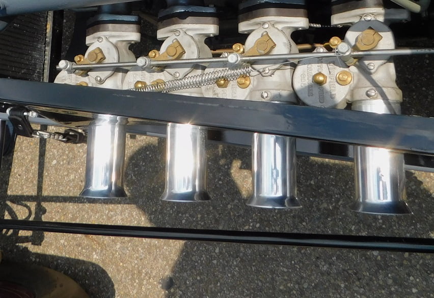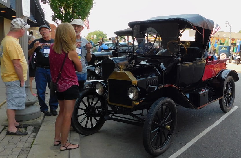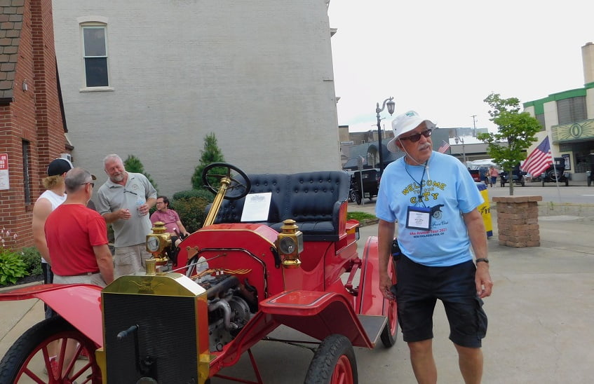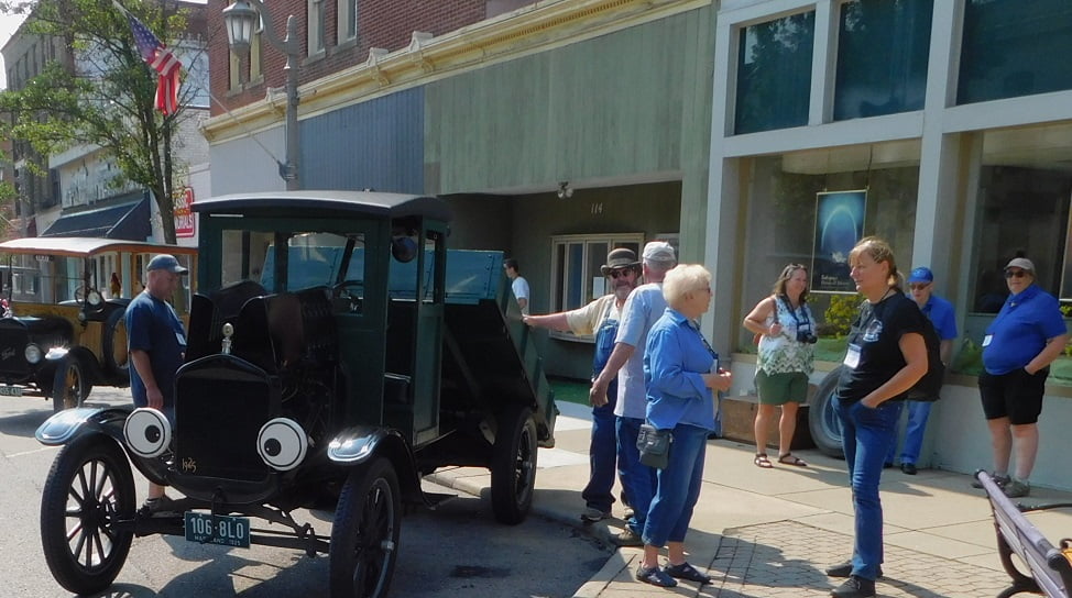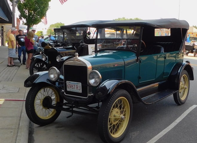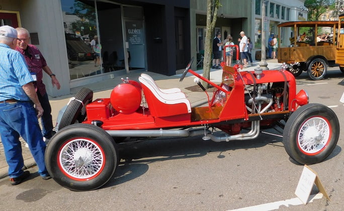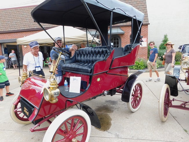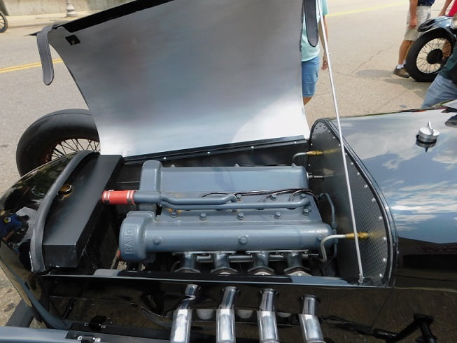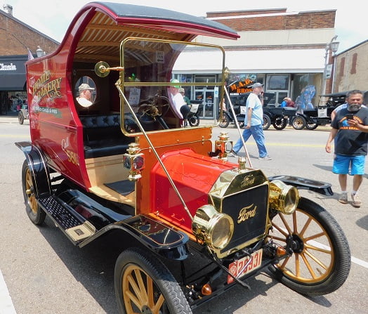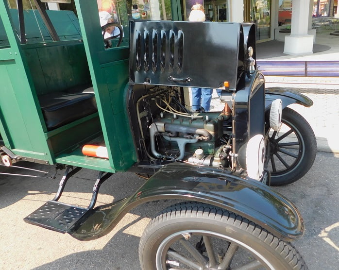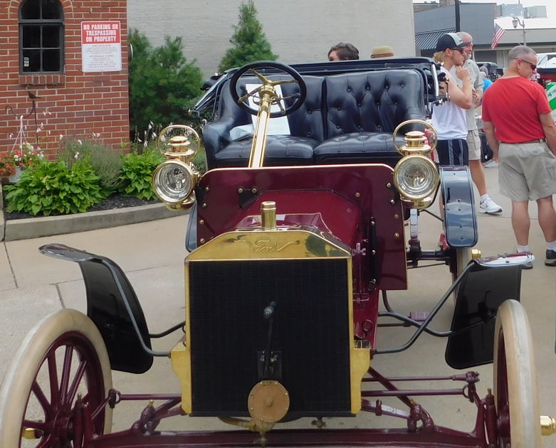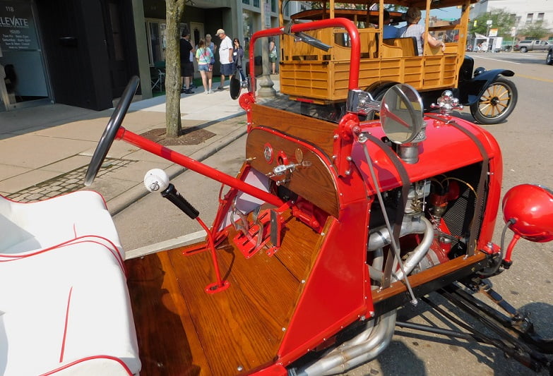 This one looks like it can handle the tour just fine.This TT has a manual cranked dump bed. The owner happily demonstrated it all day long. He did a lot of cranking!This speedster had a set of factory made “Headers by Red”. It sounded good.While the red speedster sounded good, this black speedster was a world of awesome sauce. Have you ever seen a twin cam RAJO Model T engine? It shook the town to its core when it drove in.Four big Winfield barrel valve side draft carbs provided a lot of airflow. The other side of the head had a gigantic exhaust manifold / header / pipe attached.We tried to capture the sheer volume of Model T’s parked everywhere. It is an incredible sight.This pie wagon was very photogenic and it was hard to get in there to snap a decent picture.At the entrance to the show was an early Ford display with many of the Pre – Model T Ford “Alphabet cars”. This is a 1908 Model “S” which was the immediate predecessor to the 1909 Model T.1906 Model N Ford.The 1903 Model A Ford kept busy giving rides all afternoon. As you can see it is a messy little thing.It’s rare to encounter a Model “F” Ford – but two of them?