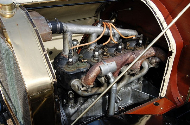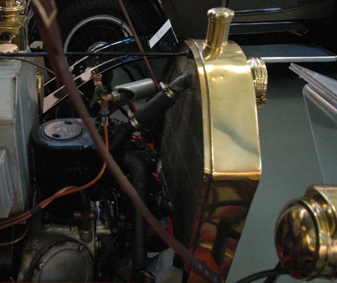 The Flanders 20 engine above has the cylinder unit cast as a group of four cylinders with non – removable cylinder head. The cylinder unit bolts to the crankcase. The engine was originally designed to be thermo – syphon cooled like the Model T Ford, however it was soon learned that the engine overheated easily. The production cars were equipped with water pumps. Ignition for the Flanders 20 was dual, there was a Splitdorf high tension magneto and also a battery powered temblor coil ignition used during starting.