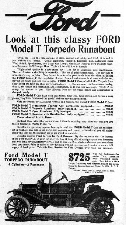Compared to the Overland Model 46, the new for 1911 Model T Ford runabout was not nearly as modern looking, although it was similar in performance and cheaper by more than $100.
