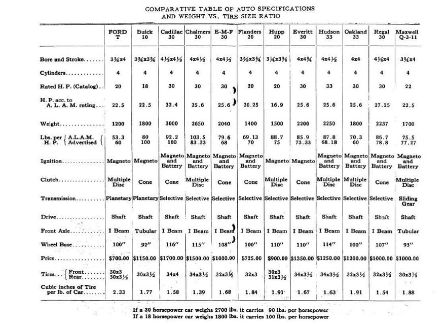 Above, Ford produced the chart showing some of its competitors in 1911. The Model T Ford was indeed stiff competition for even 30 horsepower cars because the Model T had a better power to weight ratio than the majority of cars in that horsepower range. Only the Model 33 Oakland was similar to the Model T in the power to weight ratio chart above. All the other cars lugged around considerably more weight by comparison. We will examine the competitors to the Model T to see if they offered other advantages that the chart does not talk about.