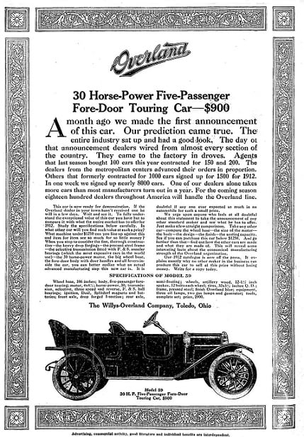 In 1911 the Overland automobile was a formidable competitor to many of the automotive brands on the market, Ford included. Overland was owned by John North Willys, a man who knew what he was doing and knew how to do it. Overland cars were well designed, high quality, and competitively priced. Unlike Ford, Overland offered a variety of models in different horsepower ratings and sizes. Three Overland cars were probably competing for Ford Model T customers, the 20 horsepower Overland Model 46 / 47 which sold for $850, the 25 horsepower Model 49 at $875 and the 30 horsepower Overland Model 59 at $900. All of these cars represented good value for the price.
