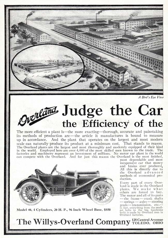 Above, the Model 46 Overland runabout and its touring version the Model 47 were 172 cubic inches, nearly the same as a Model T Ford and rated at 20 horsepower.