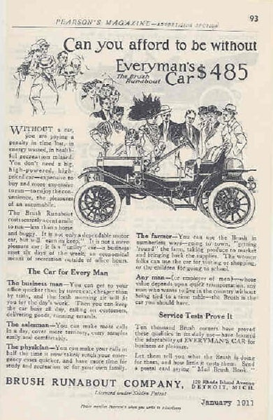 In 1911 the Brush automobile (above) was on its last legs. The odd little cars were powered by a single cylinder 10 horsepower engine. Frames were made of wood, the axles were made of wood, suspension was a coil spring mounted at each corner of the car. Wheelbase was 80 inches. Base price for the Brush was $475 which was exactly the typical cost of a horse and buggy in 1911. At that price your Brush came as shown above, with no lamps, no top, no windshield, hard rubber tires, and some assembly required.