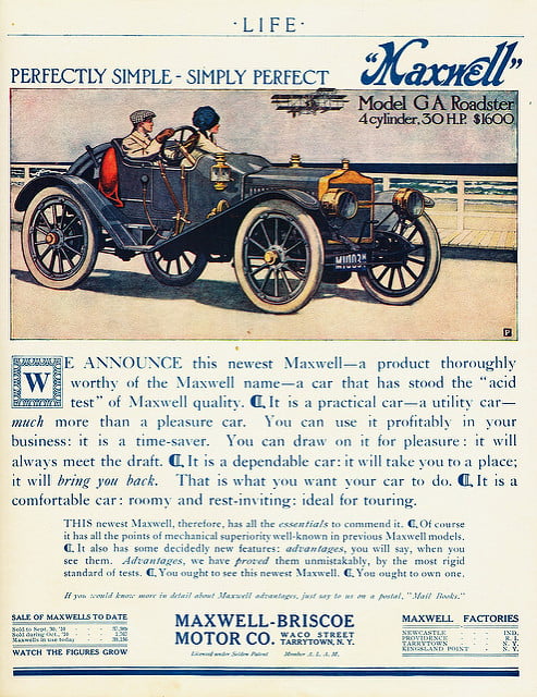 Maxwell made several models in 1911 ranging from small two cylinder Model AA to the large 30 horsepower Model GA shown in the advertisement above. Maxwell was bought by Walter Chrysler in 1925. In 1926 the company changed its name to Chrysler Corporation.