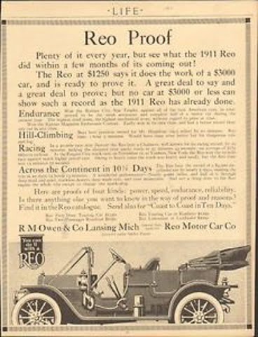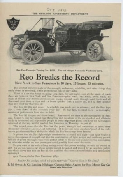 Reo had professional stunt drivers using its cars on cross country trips to prove how rugged and dependable their cars were. In 1911 there were trans – Canada runs and coast to coast USA trips that were noteworthy.