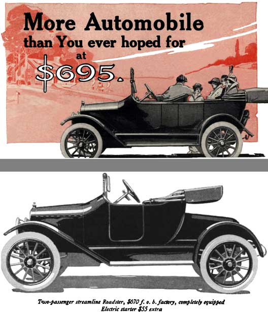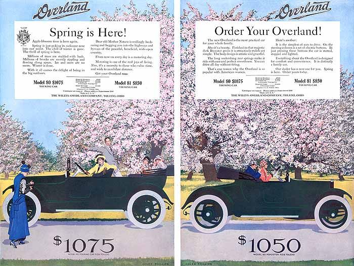Lovely Overland advertisement from 1915 shows prices ranging from $850 for a Model 81 roadster to $1075 for the larger Overland touring.