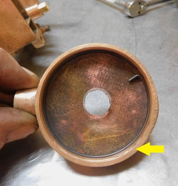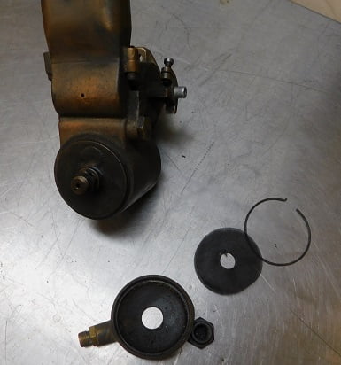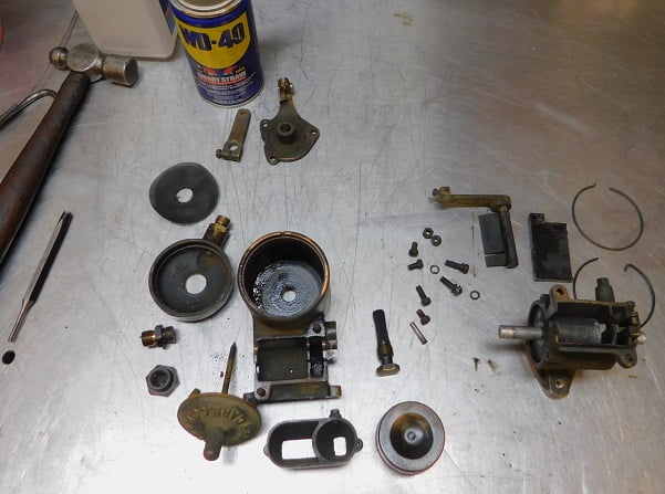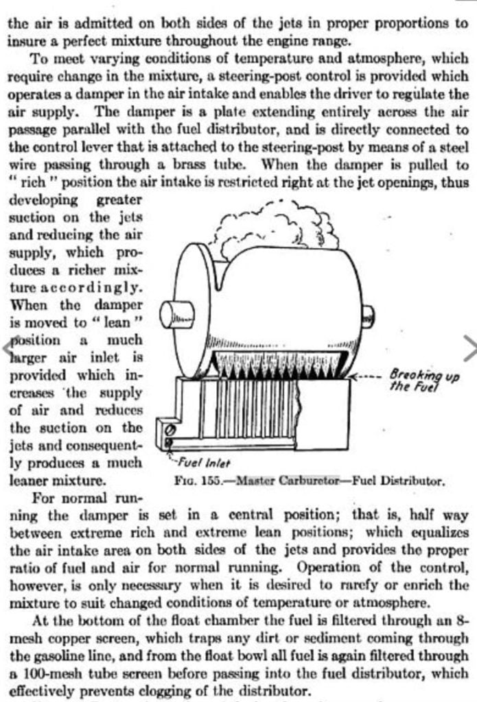 Our subject carburetor and intake were sold as a direct replacement for the Ford supplied intake and carburetor. Ours looks pretty good for being 100 years old other than a lot of grime and grease and surface corrosion. The carburetor is made from red brass and yellow brass castings. Hardware is primarily steel. The throttle valve is a barrel design made of machined aluminum alloy.Along with the intake manifold each Miller Master carburetor came with a cable operated mixture control. The mixture control operated a “damper” door inside the carburetor that blocked off much of the airflow if fully closed. This served as the “choke” for starting a cold engine. Once the engine is warm the mixture control is opened nearly all the way depending upon the engine, fuel, and altitude requirements.We found that the car ran best with the damper moved mostly, but not all the way, towards full lean. The engine side of our carburetor shows the cable operated mixture lever in the full lean position.The air inlet is separated into a primary (round) and secondary (larger, LH side) area. This design is unlike any other carburetor, as is the majority of the Miller carburetor.The underside of our Miller carburetor shows the fuel inlet which can be pointed in any direction. We ended up finding this position was ideal for a Model T.The throttle is similar to the Winfield carburetor in that it uses a barrel type throttle valve. The Miller Master throttle valve uses a graduated spiral opening that sequentially uncovers a series of fuel jets as it allows greater amounts of airflow. The photo above shows the throttle closed for idle.Here we see the throttle partly open. Notice the curved leading edge of the slot in the barrel valve.As the throttle is opened further more of the jets are exposed at the bottom of the barrel, as the top exposes more of the intake to fuel / air mixture. This makes the Miller Master carburetor very responsive.At full throttle the series of jets are entirely exposed as the intake is completely open for fuel / air mixture to flow. The barrel valve eliminates having a throttle shaft in the middle of the intake air flow.The Miller Master carburetor was patented in 1917 and could be installed in a variety of ways depending upon the application. This drawing shows the holes drilled in the fuel distributor / jet bar with the throttle wide open.We start disassembly by removing the snap ring which retains the top of the float chamber. This float / needle valve design was used by Stromberg, Marvel and other companies. We suspect someone was paying somebody royalties. Notice the accumulated dirt in the bottom of the carburetor bowl. This is good evidence that this carburetor was used a lot. Next we remove the nut which secures the fuel inlet to the bottom of the float bowl. Inside is a snap ring securing a very fine fuel filter screen that is crusted with more dirt,The upper body of the Miller Master carburetor is secured to the lower body by two nuts on studs. This one can be loosened with a socket. The other side requires an open end wrench.there is a secondary fuel filter just below the jet bar (Miller calls it a Fuel Distributor). This filter is also clogged with dirt.You can see the fuel jet bar here marked with the letter “S” attached to the lower body.We were unable to remove the throttle stop from the barrel valve despite lots of effort. In the end we decided that the better part of valor is often discretion. All of the brass parts went into the carburetor cleaning solution while the steel hardware went into a jar filled with Evaporust.After soaking for a couple days in carb cleaner each part was scrubbed using Scotchbrite and soapy water. Interestingly, Miller made this carburetor without any seals or gaskets. Each part depends upon accurate machine work to prevent fuel and air leaks. You need to be careful not to disturb any of these critical junctions.The first part to be installed is the jet bar (fuel distributor) which is secured to the lower body with a single screw. We are using a specially ground screwdriver bit in a 1/4″ drive socket to prevent marring the screws and to allow secure tightening of each fastener. The arrow points to the tiny holes that supply fuel to the air. This part is the heart of the carburetor, and is made from many pieces of brass sheet soldered together.Next the air damper / mixture control assembly is set in place in the lower carburetor assembly. It is shown in the open / full lean position.This screw interfered with movement of the mixture lever unless I removed its lock washer. It came apart that way too, so apparently it was meant to be that way originally. I removed the lock washer after this picture was taken.The upper carburetor can be mated to the lower carburetor. A few taps of the rubber mallet were required because the parts fit together so tightly. No gaskets are used, and no sealant. It just fits.We tightened the nuts. Not shown, a steel taper pin secures the throttle idle adjuster to the throttle valve shaft. We installed it using a tiny hammer.Our 1925 Dykes manual gives a nice picture of the Miller Master carburetor and its unique fuel distributor / jet plate. An elbow is mounted to the primary air inlet. It could be pointed up and connected to a heat tube for winter use, or rotated downwards and left open when it was not winter time for best performance.Fuel must pass through this secondary screen before it gets to the tiny passages in the fuel distributor. We install it and tighten it with a 5/8″ wrench. Again no gasket or seal of any kind is used.We reinstalled the float oriented as it was upon disassembly. The red brass portion is “up”. We don’t know if this matters but if it does, it won’t be a problem.The float bowl cover is held in place by a very tight fitting snap ring. It required that we tap it in place using a 3/32″ pin punch. Again, no gasket or sealant of any kind is used.A dust cap covers the top of th