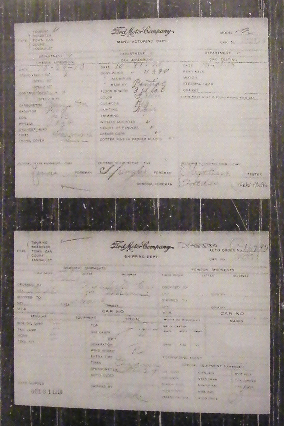 The so – called “build sheets” are in fact a production inspection traveler checklist that was used on the shop floor to denote what parts were used and a tool for the inspector to ensure nothing was overlooked. The brands of many items were noted, such as the headlamps, carbide generator, speedometer, top, windshield and tires. The inspector would “grade” the paint finish, which always seems to rate only “fair”.