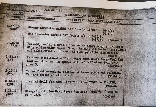One of the questions on my mind this time was the exact date that the finish changed on the parking brake lever and release handle. I knew that this set of parts was brass plated during 1909, and that the early 1910 cars continued to have it brass plated. My quest was to find out the exact dates of the change from brass plating to black enamel.