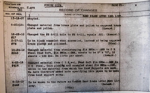 In the case of the brake release handle Factory Number T-879 “Hand Brake Pawl Lift” the record of changes is as follows: